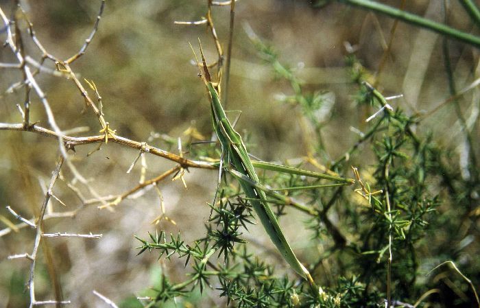![]() Gewöhnliche Nasenschrecke (Acrida ungarica) Insel Pag, Kolan (Kroatien), 05.08.2000 |