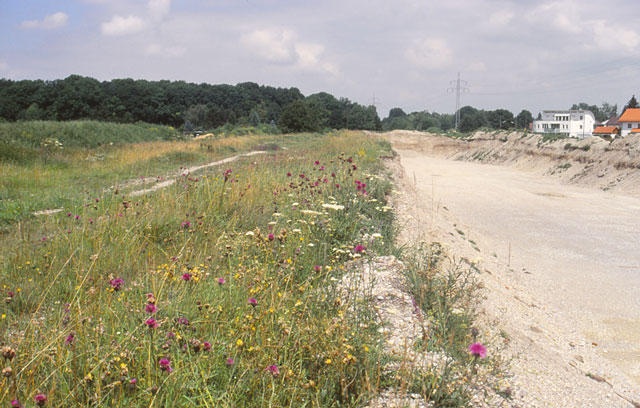Seit dem Dritten Reich brachliegende Kiesflur, die seitdem zu einem der wertvollsten Tagfalter- und Heuschreckenbiotope Münchens heranwuchs.