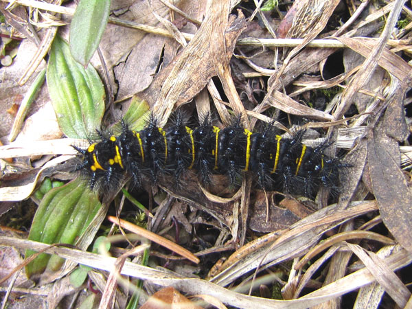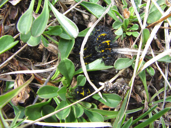 Zwei Raupen gleichzeitig fressend an Globularia cordifolia (Herzblättrige Kugelblume)